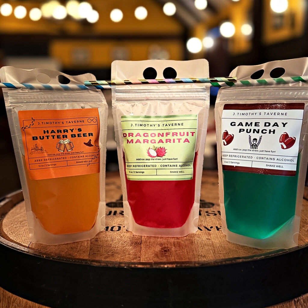 Beer cans and draft beer beer are available to take home, as well as Cocktail Pouches, all wine bottles and our Quart sizes of Sangria. J. Tim’s is your one-stop shopping outlet for any liquor!