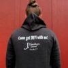 Black “got wings?” hoodie. On the back: “Come Get Dirty With Us”. 8.26oz weight, 80/20 ring spun cotton/poly fleece. Tear away label. This runs true to size.