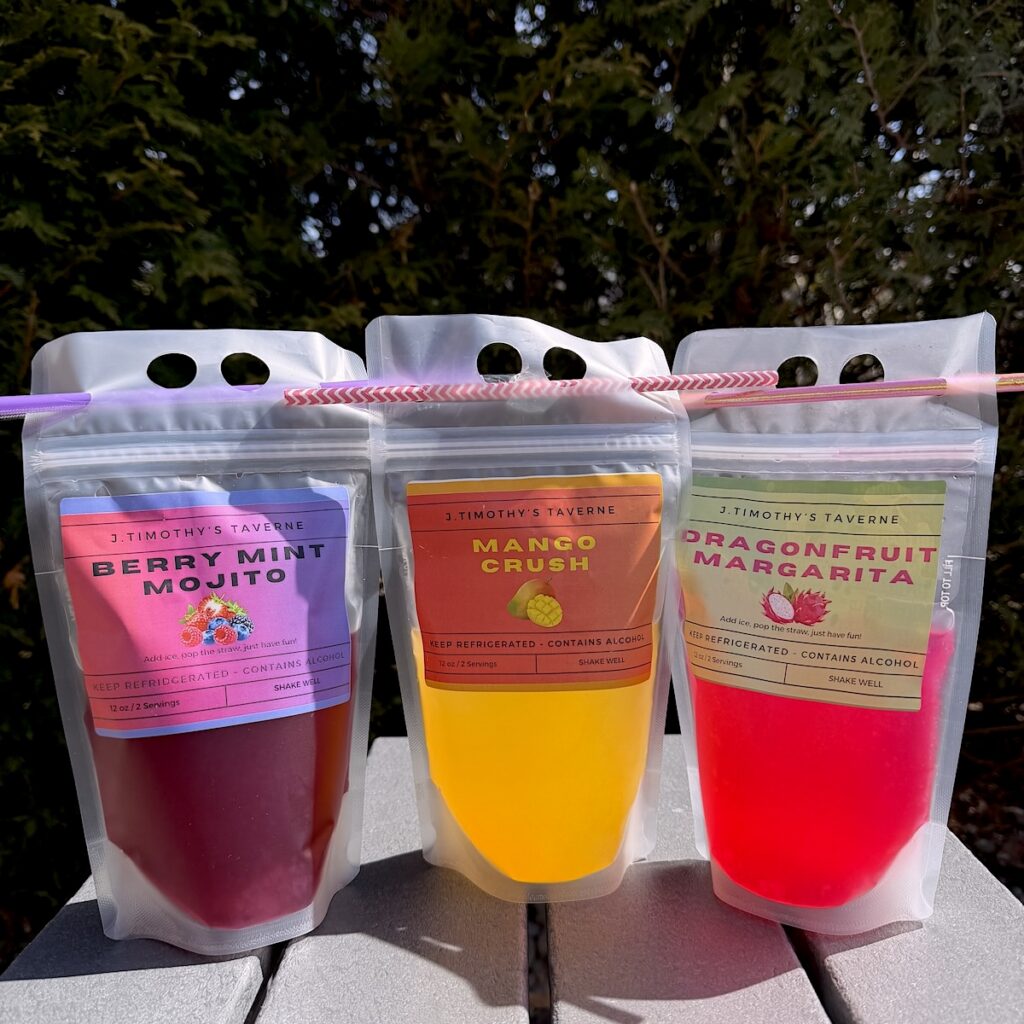 Capri Suns but for adults! They’re packaged securely in a plastic pouch; just shake and insert the straw. Add ice or not. There are two (2) drinks in each pouch for only $15.00.
